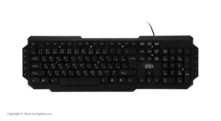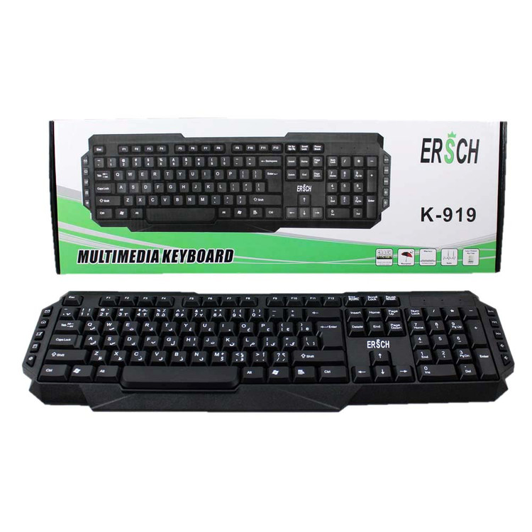 کیبورد سیم دار ارش مدل K919 دارای حروف فارسی بر روی کلیدها است. این نوع کیبورد دارای طراحی منحصر به فرد و وزن مناسبی است. کیبورد ERSCH K-919 دارای رابط USB است و به کامپیوتر متصل می شود و در مجموع دارای ۱۱۳ عدد دکمه است و جنس بدنه از پلاستیک ساخته شده است.کیبورد برند Ersch مدل 919 دارای طراحی ساده می باشد که باعث افزایش سرعت عملکرد کاربر می شود. این کیبورد شامل 104 کلید می باشد.